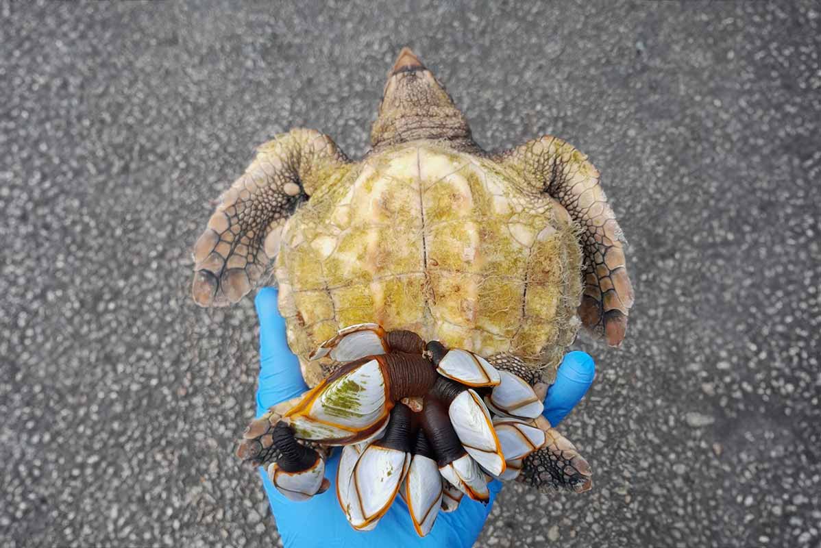 Tortue caouanne avec de nombreux anatifes sur sa ventrale