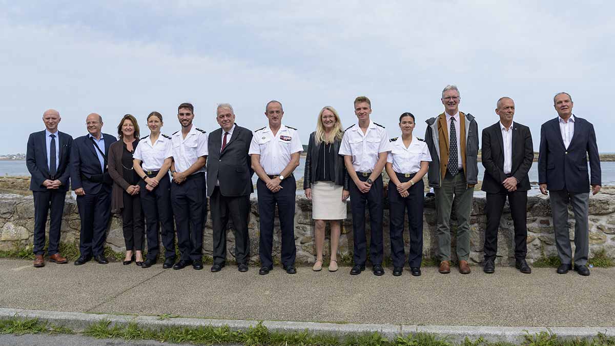 Photo de groupe avec l'amiral Nicolas Vaujour, chef d'état-major de la marine (CEMM) , les quatres volontaires officiers aspirants (VOA) de la mission Bougainville, l'amiral Christophe Prazuck ainsi que les grands acteurs de la mission Bougainville, devant le front de mer de Roscoff , le 26 septembre 2023 à Roscoff. Crédit photo : Sarah Lacarrere / Marine Nationale / Défense