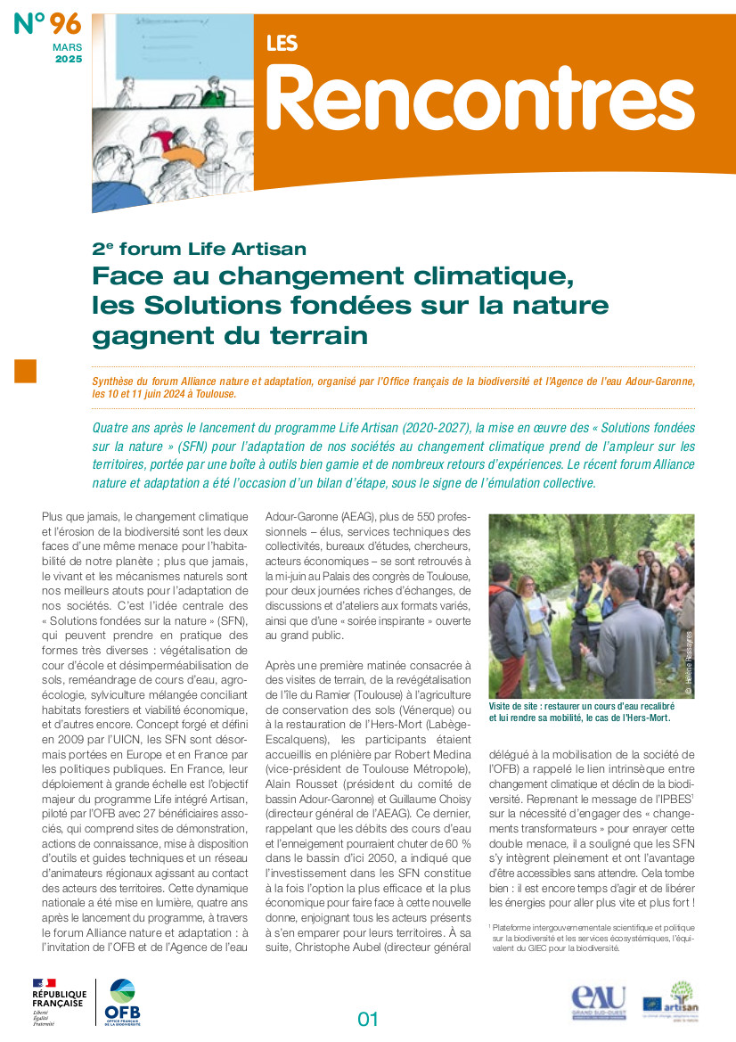 Quatre ans après le lancement du programme Life Artisan (2020-2027), la mise en œuvre des "Solutions fondées sur la nature" (SFN) pour l’adaptation de nos sociétés au changement climatique prend de l’ampleur sur les territoires, portée par une boîte à outils bien garnie et de nombreux retours d’expériences. Le récent forum Alliance nature et adaptation a été l’occasion d’un bilan d’étape, sous le signe de l’émulation collective.