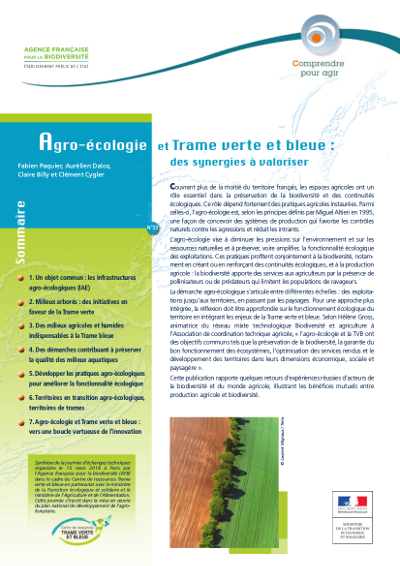 Selon Hélène Gross, animatrice du réseau mixte technologique Biodiversité et agriculture à l'Association de coordination technique agricole, " l'agro-écologie et la TVB ont des objectifs communs tels que la préservation de la biodiversité, la garantie du bon fonctionnement des écosystèmes, l'optimisation des services rendus et le développement des territoires dans leurs dimensions économique, sociale et paysagère ".