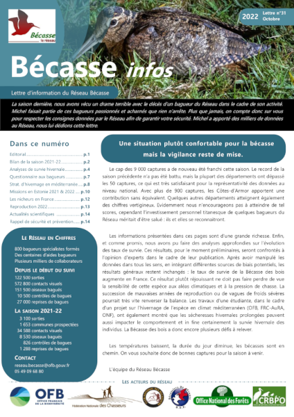 Cette lettre annuelle n°31 revient sur le bilan de la saison de baguage 2021-22 : une bonne saison pour la majorité des départements avec un peu plus de 9 000 captures. À découvrir aussi : le bilan des missions en Estonie et les résultats des dernières études réalisées, à savoir un bilan de la survie hivernale des bécasses depuis les années 1990 et une étude des stratégies d’hivernage en milieux méditerranéens.
