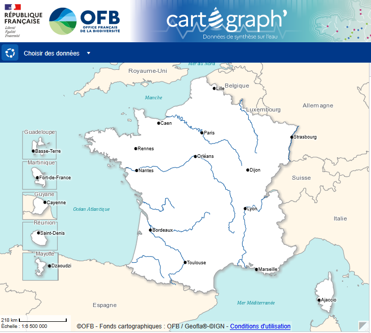 Accessible depuis le portail eaufrance.fr, CartOgraph’ a pour but d’aider à la compréhension des données diffusées sur l’eau et les milieux aquatiques. Il fournit des données homogènes, annuelles ou pluriannuelles, à l’échelle de la France entière (métropole et outre-mer).
