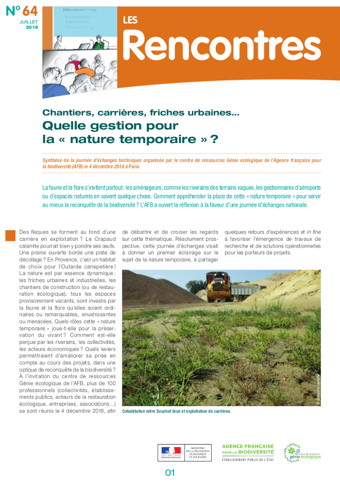 La faune et la flore s'invitent partout : les aménageurs, comme les riverains des terrains vagues, les gestionnaires d'aéroports ou d'espaces naturels en savent quelque chose. Comment appréhender la place de cette " nature temporaire " pour servir au mieux la reconquête de la biodiversité ? L'Agence française pour la biodiversité a ouvert la réflexion à la faveur d'une journée d'échanges nationale.