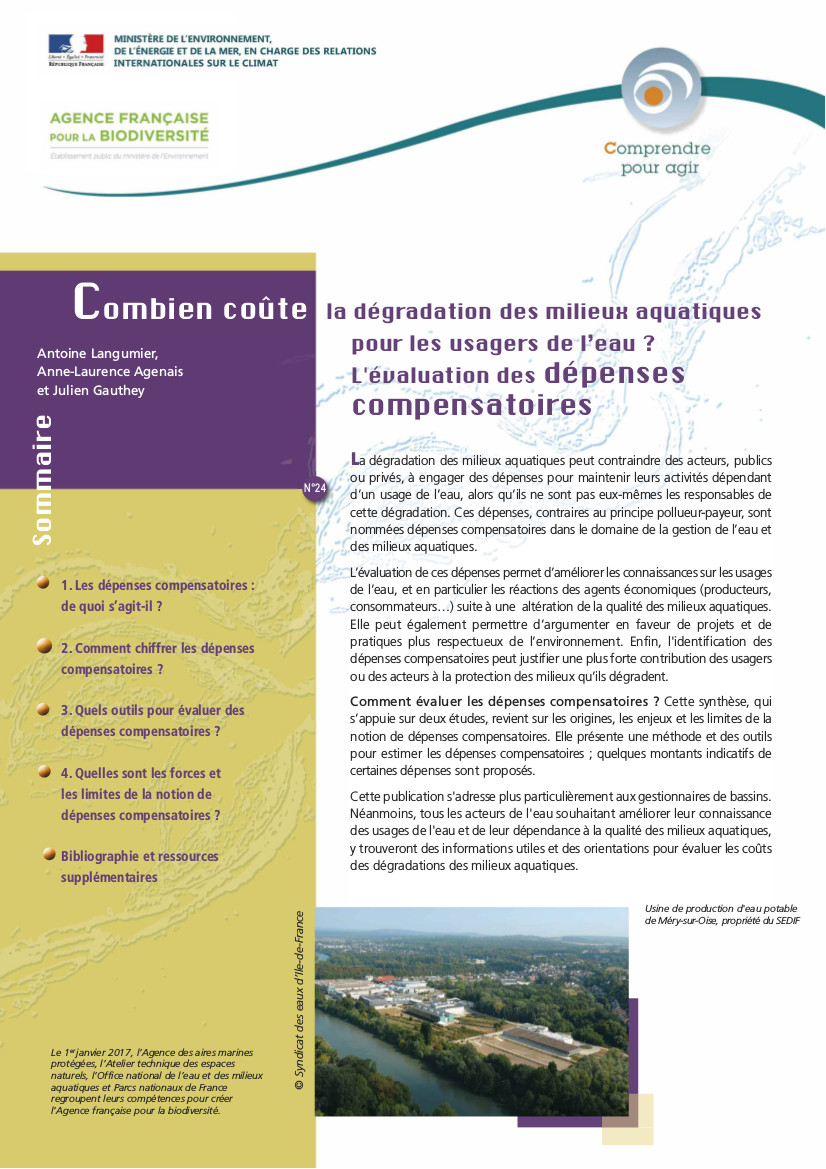 La dégradation des milieux aquatiques peut contraindre des acteurs à engager des dépenses pour maintenir leurs activités dépendant d’un usage de l’eau, alors qu’ils ne sont pas responsables de cette dégradation. L’évaluation de ces dépenses dites compensatoires a plusieurs intérêts. Cette publication qui s'adresse notamment aux gestionnaires de bassins, revient sur cette notion de dépenses compensatoires et présente une méthode et des outils pour les chiffrer.