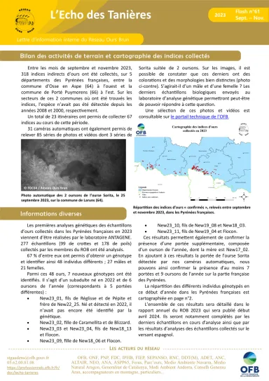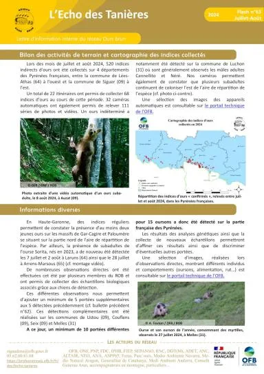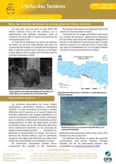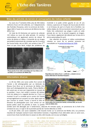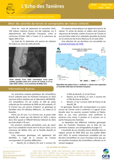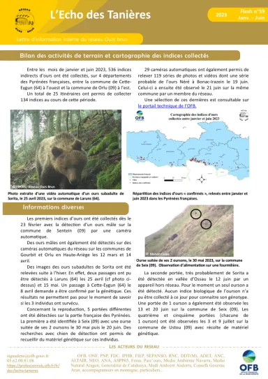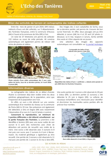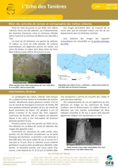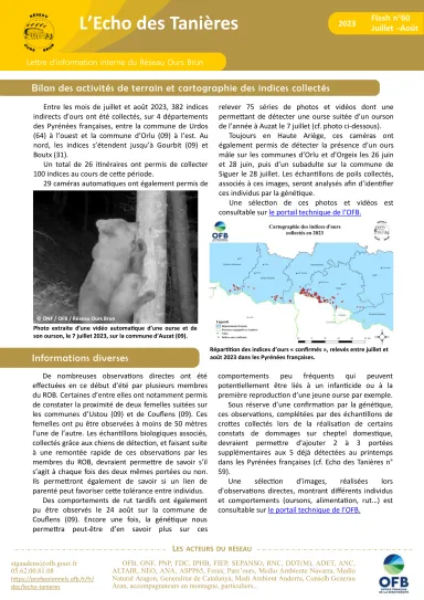 Lettre d'information du réseau Ours brun, l’Écho des tanières synthétise, en cours de saison, les relevés de terrain effectués par le réseau : itinéraires de prospection, suivi d’appareils photo et vidéo automatiques. Il résume aussi des faits marquants concernant le suivi de l’espèce dans les Pyrénées.