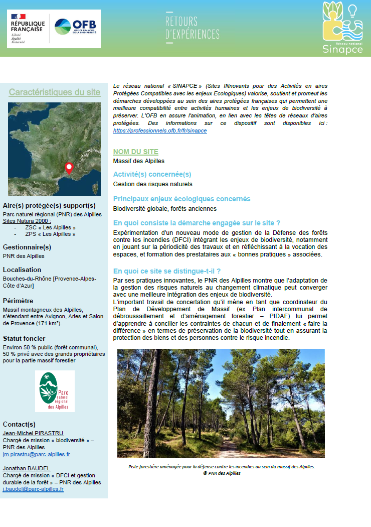 Le Parc naturel régional des Alpilles propose un retour sur une expérience de gestion de la Défense des forêts contre les incendies (DFCI) intégrant les enjeux de biodiversité. Dès les années 2000, l'intégration des enjeux de biodiversité a été pensé au travers des documents cadres de gestion de ce massif forestier, le plus grand des Bouches du Rhône avec 30 000 hectares. Les principales actions portent sur l'adaptation du calendrier des travaux DFCI et l'instauration de pâturages dans certaines zones clés.