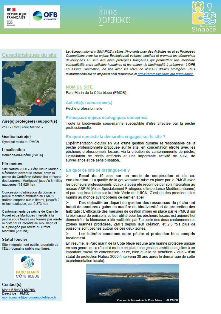 Le Parc marin de la Côte Bleue (PMCB) propose un retour sur une expérience de gestion durable de la pêche professionnelle maritime artisanale débutée en 1983 et ayant donné naissance à 2 zones marines protégées. Le PMCB entretien une collaboration étroite avec les pêcheurs professionnels à tous niveaux, y compris dans la gestion du milieu. Présent dans de nombreux projets (technologique, scientifique, accompagnement, partages des connaissances...), le PMCB est aujourd'hui largement reconnu pour la qualité de la gouvernance et de la concertation mise en œuvre.
