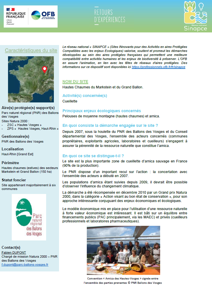 Le Parc naturel régional (PNR) des Ballons des Vosges propose un retour sur une expérience de gestion durable de l'arnica des sommets vosgiens débutée en 2007 et ayant donné naissance à une charte « Arnica des Hautes-Vosges », portée par le PNR des Ballons des Vosges et le Conseil Départemental des Vosges. Ainsi, l’ensemble des acteurs concernés (communes propriétaires, exploitants agricoles, laboratoires et cueilleurs professionnels) s’engagent à assurer la pérennité de la ressource naturelle que constitue l’arnica dans ce site Natura 2000.