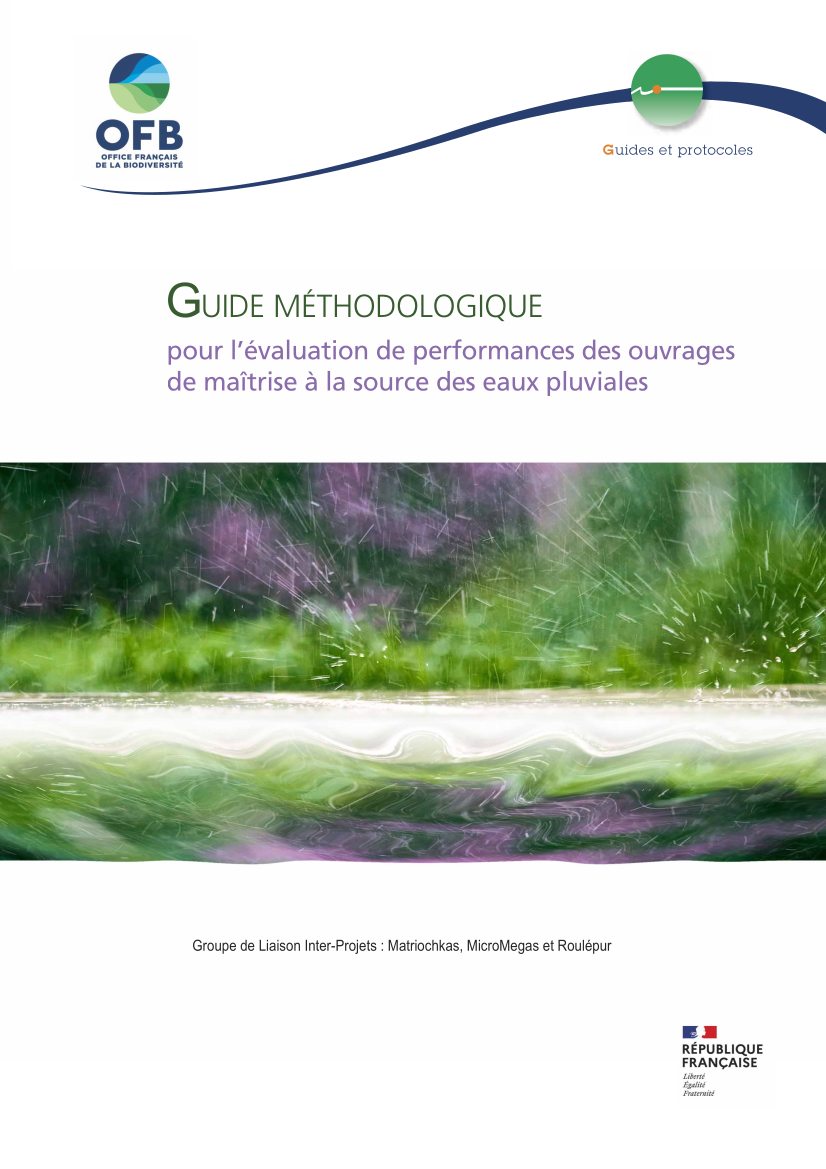 Flanagan K. (coord.), Barraud S., Gromaire M.C. et Rodriguez F. 2022. Guide méthodologique pour l’évaluation de performances des ouvrages de maîtrise à la source des eaux pluviales - Groupe de Liaison Inter-Projets : Matriochkas, MicroMegas, Roulépur. Office français de la biodiversité, collection Guides et protocoles, 164 pages.