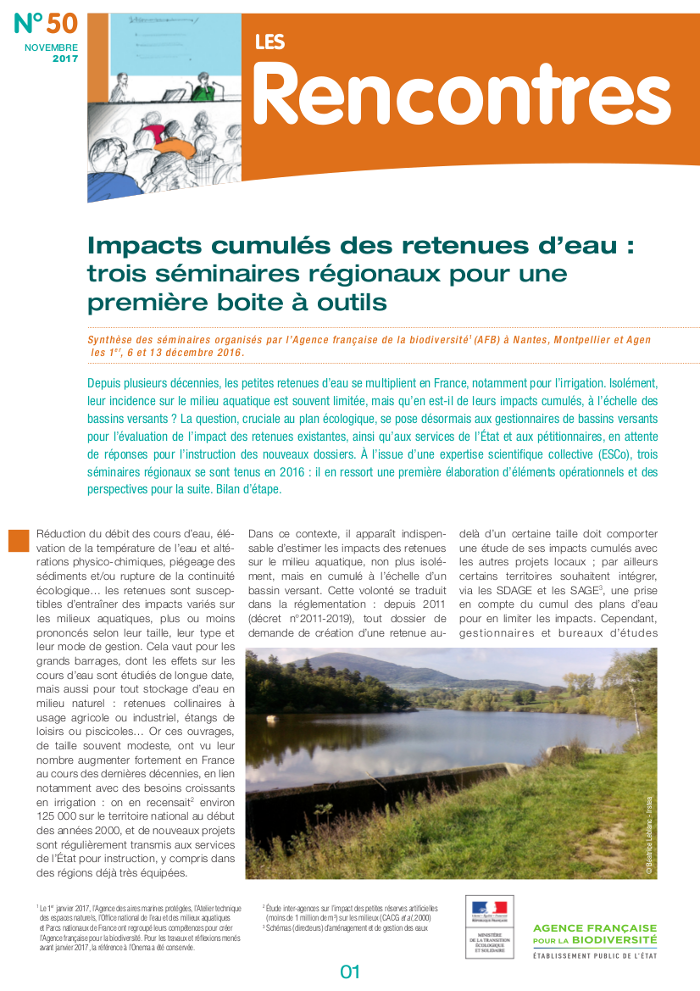 Les petites retenues d’eau se multiplient en France. Isolément, leur incidence sur le milieu aquatique est souvent limitée, mais qu’en est-il de leurs impacts cumulés, à l’échelle des bassins versants ? La question, cruciale au plan écologique, se pose aux gestionnaires de bassins versants, ainsi qu’aux services de l’État et aux pétitionnaires, en attente de réponses pour l’instruction des nouveaux dossiers. À l’issue d’une expertise scientifique collective, 3 séminaires régionaux ont eu lieu en 2016 : il en ressort une 1re élaboration d’éléments opérationnels et des perspectives pour la suite. Bilan d’étape.