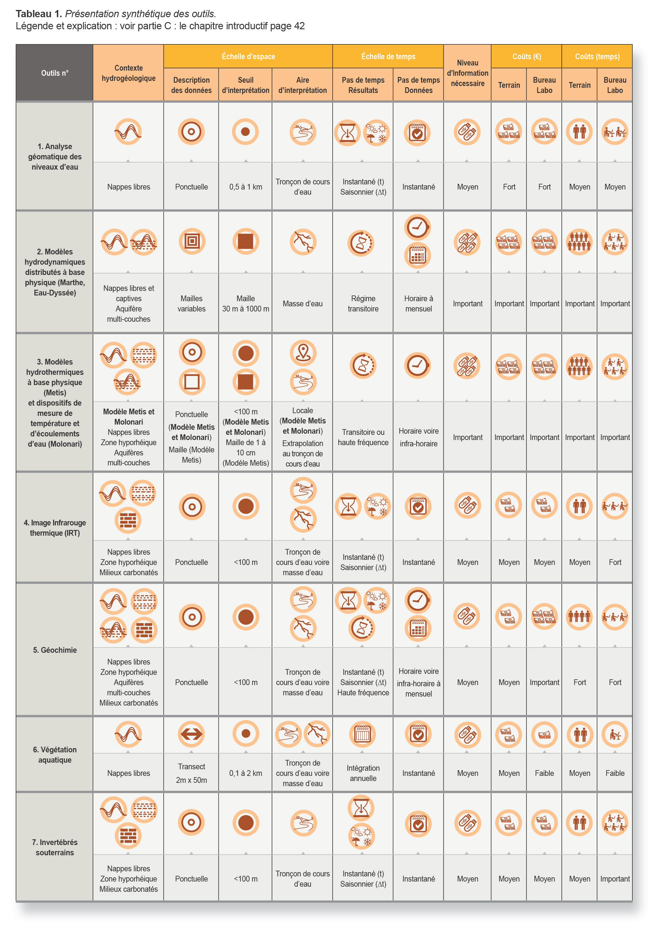 Outils et méthodes présentés : analyse géomatique des niveaux d’eau, modèles hydrodynamiques distribués à base physique, modèles hydrothermiques et dispositifs de mesure de température et d’écoulements d’eau, image thermique infrarouge, géochimie, végétation aquatique, invertébrés souterrains.