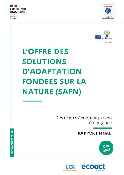 ADEME, Valentin Framont (EcoAct), Jordan Hairabedian (EcoAct), Joanne Schanté (LGI), Cosima Malandrino (LGI), Inès Centeno (LGI). 2021. L'offre des solutions d'adaptation au changement climatique (SAFN) - Des filières économiques en émergence, Rapport final. 87 pages.