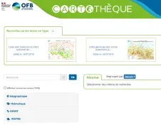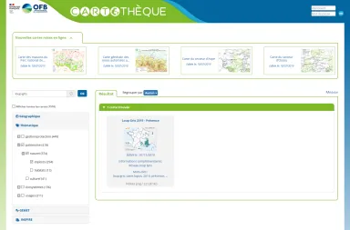 Outil web ouvert à tous, la cartothèque permet de rechercher, consulter et télécharger l'ensemble des cartes produites par l’Office français de la biodiversité (OFB) dans les domaines de l’eau, des milieux marins et de la biodiversité. 1 700 cartes sont aujourd’hui disponibles. Rendez-vous sur cartotheque.ofb.fr.