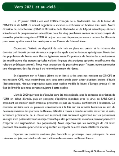 Cette 6e lettre du réseau Lièvre présente le bilan des suivis réalisés par les partenaires en 2020, ainsi que les actualités du réseau.
