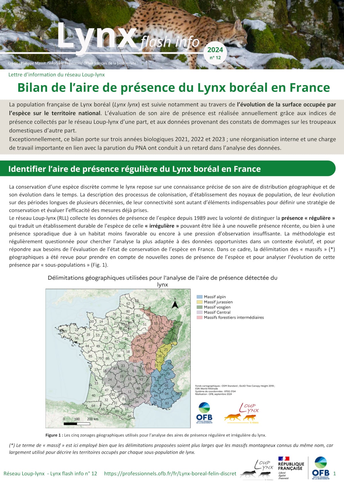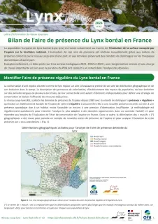 La population française de Lynx boréal (Lynx lynx) est suivie notamment au travers de l’évolution de la surface occupée sur le territoire national. L’évaluation de son aire de présence est réalisée annuellement grâce aux indices collectés par le réseau Loup-lynx, ainsi qu'aux données provenant des constats de dommages sur les troupeaux domestiques. Ce bilan de l’aire de présence du Lynx boréal en France porte sur trois années biologiques (2021, 2022 et 2023). Les résultats montrent une extension de l'aire de présence régulière.
