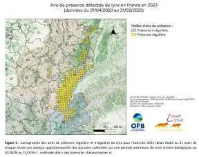 Cartographie des aires de présence régulière et irrégulière du lynx pour l’exercice 2023 (Lynx flash info 2024, fig 5, OFB)