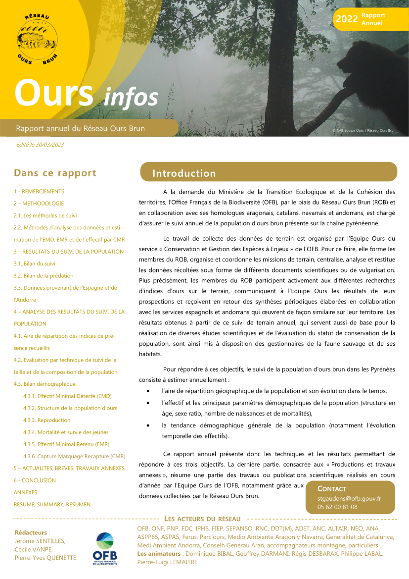 Avec 76 individus détectés en 2022, l'effectif de la population d'Ours brun continue progressivement d'augmenter dans les Pyrénées. C'est l'un des résultats présentés dans le rapport annuel 2022 du suivi de l'espèce dans les Pyrénées françaises, réalisé par le réseau Ours brun.