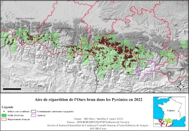 Localisations des indices de présence « confirmés » et aire de répartition de l’espèce pour 2022 (Réseau Ours brun, OFB)