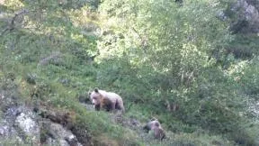Une des 13 portées détectées en 2024 : F036 et son ourson de l’année (F167), le 12 août 2024, sur la commune de Couflens (09) (Réseau Ours brun, OFB, 2025)