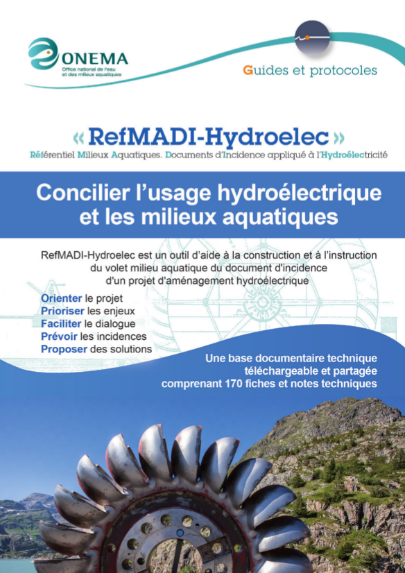 Afin d’aider les porteurs de projets à construire les dossiers et les services de police à les instruire sur une base commune, le référentiel technique RefMADI-Hydroelec, développé par l’Onema en liaison avec le Ministère de l’écologie, du développement durable et de l’énergie (DEB), propose un ensemble de fiches techniques traitant du volet milieu aquatique des études d’impacts et documents d’incidences.