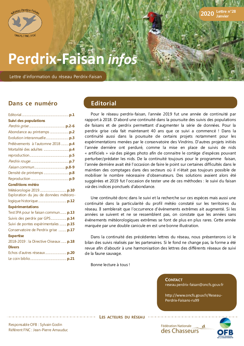 Cette lettre présente le bilan des suivis réalisés par les partenaires du Réseau Perdrix-Faisan : suivi des populations de perdrix grise, perdrix rouge et faisan commun, les conditions météo, ainsi que des expérimentations et éléments d'expertise.