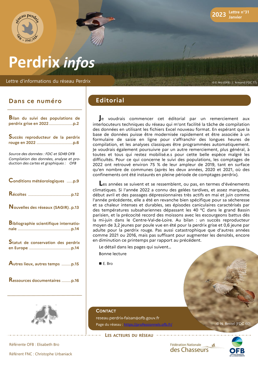 Cette 31e lettre du réseau Perdrix présente le bilan des suivis réalisés en 2022 ainsi que différentes informations associées : suivi des populations de perdrix grise, succès reproducteur de la perdrix rouge, conditions météorologiques et récoltes, ressources documentaires et bibliographie internationale... Une année 2022 marquée par la sécheresse et la chaleur intenses et durables, des moissons d'une précocité record et très courtes, avec des observations très inquiétantes sur la reproduction.