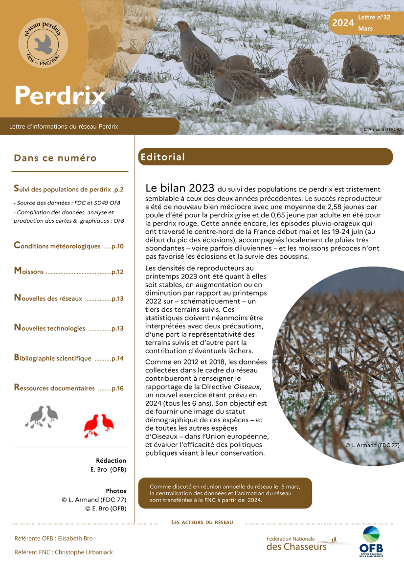 Cette 32e lettre du réseau Perdrix présente le bilan des suivis de population réalisés en 2023 (densités de couples au printemps, succès reproducteur) complété comme habituellement avec le descriptif des conditions météorologiques et de la chronologie des moissons dans le centre-nord de la France. Quelques cas Sagir ont été répertoriés en 2023 pour les espèces perdrix grise et rouge. Ce numéro propose également un petit panorama de la bibliographie internationale, et des ressources sur les nouvelles technologies utilisées pour des suivis de la faune sauvage (drône, piège-photos et outil d'identification automatique des espèces).