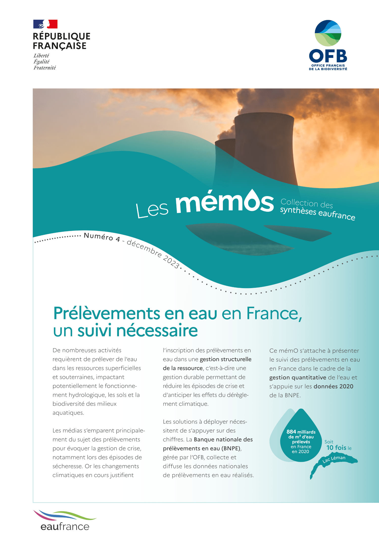 Ce 4e Mémos aborde les prélèvements en eau en France sous différents aspects grâce en particulier aux données collectées au sein de la Banque nationale des prélèvements en eau (BNPE), gérée par l'Office français de la biodiversité. Les informations telles que les volumes ou les usages permettent d'orienter les solutions à mettre en œuvre pour une gestion durable de la ressource en eau.