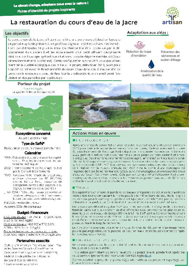 Le cours d'eau de la Jacre, affluent de la Vire anciennement déplacé, présentait un profil rectiligne et incisé entraînant des inondations lors d'épisodes de pluie intense. Ce phénomène était amplifié par le débordement d'un ancien bief, les écoulements d'un petit affluent déconnecté, ainsi que par un ouvrage hydraulique sous dimensionné et mal positionné. Cette configuration a conduit à un appauvrissement de la qualité écologique des milieux. Le projet, débuté en 2019, a pour objectif de retrouver la fonctionnalité du cours d'eau dans son lit majeur afin de préserver la ressource en eau, de favoriser la biodiversité tout en améliorant l'exploitation des parcelles par le pâturage.