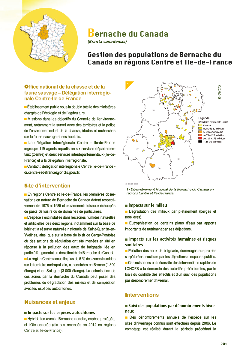 Un retour d'expérience de gestion sont disponibles sur l'éradication ou gestion de la Bernache du Canada, précisant les enjeux, interventions, mise en œuvre, résultats et bilan, ainsi que les perspectives et des éléments de réglementation.