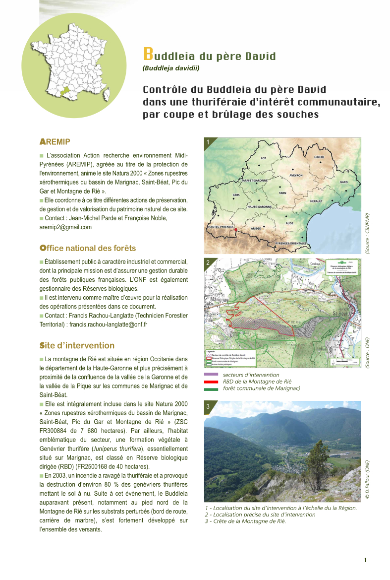 Un retour d'expérience de gestion est disponible sur le contrôle du Buddleia du père David dans une thuriféraie d’intérêt communautaire, par coupe et brûlage des souches. Le document précise les enjeux, interventions, mise en oeuvre, résultats et bilan, ainsi que les perspectives.