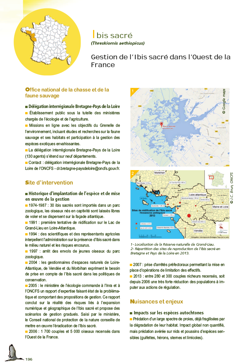 Des retours d'expérience de gestion sont disponibles sur l'éradication ou gestion de l'Ibis sacré, précisant les enjeux, interventions, mise en oeuvre, résultats et bilan, ainsi que les perspectives et des éléments de réglementation.