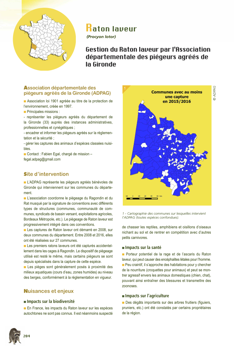 Un retour d'expérience de gestion est disponible sur la régulation du Raton laveur, précisant les enjeux, interventions, mise en oeuvre, résultats et bilan, ainsi que les perspectives et des éléments de réglementation.