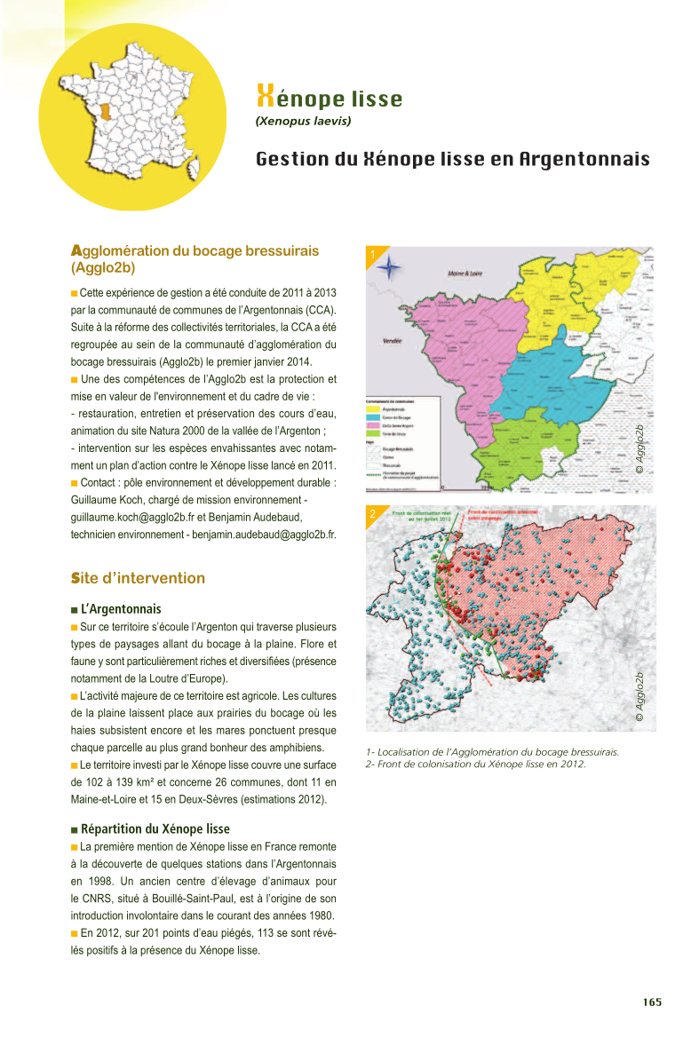 Un retour d'expérience de gestion est disponible sur la gestion du xénope lisse en Argentonais. Le document précise les enjeux, interventions, mise en oeuvre, résultats et bilan, ainsi que les perspectives.
