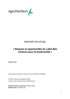 Le label bas carbone, créé en 2018 par le Ministère chargé de l'Environnement, est un standard de certification qui propose à tout financeur souhaitant compenser ses émissions de gaz à effet de serre ou contribuer à la neutralité carbone de financer des projets qui permettent de réduire des émissions ou de stocker du carbone. Ce rapport de stage, rédigé par Boniface Parlos suite à son stage au sein de l'Office français de la biodiversité entre mai et août 2023, présente les risques et les opportunités pour la biodiversité du label bas carbone. Il propose également des pistes d'évolution pour que le label s'élargisse à une contribution environnementale plus globale et présente des cobénéfices pour la biodiversité.