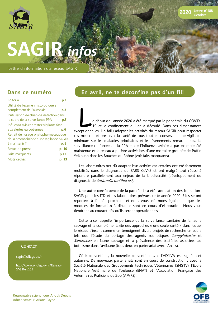 Dans le contexte exceptionnel de la pandémie de Covid-19, les activités du réseau Sagir ont dû être adaptées pour préserver la santé de tous, tout en conservant une vigilance minimum sur les maladies prioritaires et les événements remarquables. À titre d'exemples, la surveillance renforcée de la peste porcine africaine (PPA) et de l’Influenza aviaire a été maintenue et le réseau a été activé lors d'un évènement de mortalité groupée de Puffin Yelkouan dans les Bouches du Rhône.