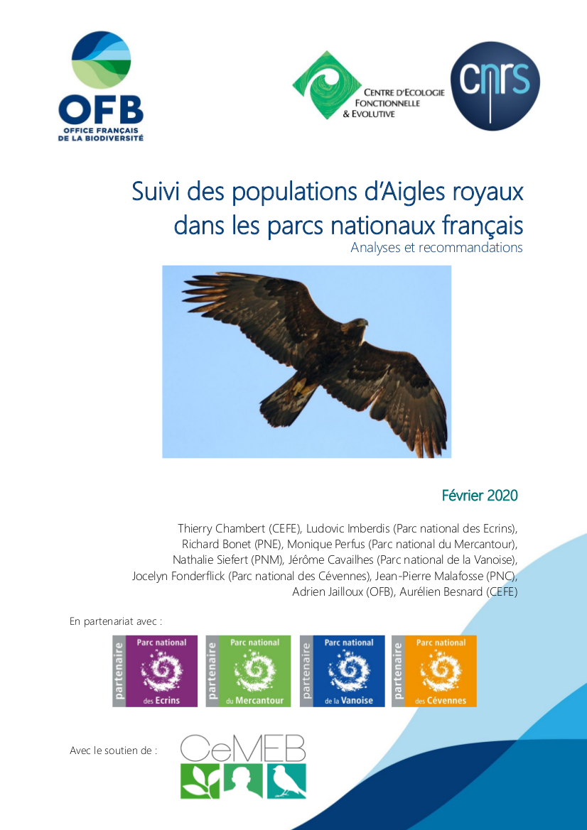 Chambert T., Imberdis L., Bonet R., Perfus M., Siefert N., Cavailhes J., Fonderflick J., Malafosse J.P., Jailloux A., Besnard A., 2020. Suivi des populations d’Aigles royaux dans les parcs nationaux français, analyses et recommandations. Coopération OFB-Cefe. 44 pages.