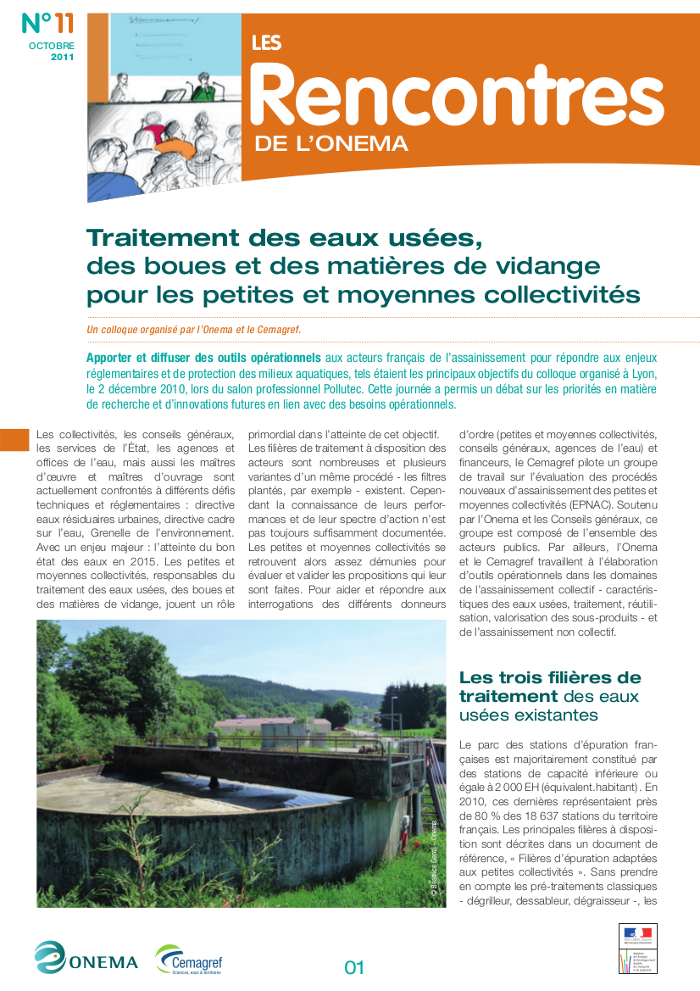 Apporter et diffuser des outils opérationnels aux acteurs français de l'assainissement pour répondre aux enjeux réglementaires et de protection des milieux aquatiques, tel était le principal objectif de ce colloque organisé lors du salon professionnel Pollutec de 2010. Il a aussi permis un débat sur les priorités en matière de recherche et d'innovations futures en lien avec des besoins opérationnels.