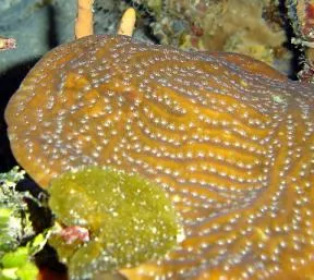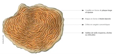 Aspect : colonies en forme de plaques larges et épaisses, se superposant souvent, qui sont arrondies ou aiguës ; surface supérieure composée de rangées concentriques de crêtes séparées par des vallées de taille moyenne, droites ou réticulées où se trouvent les polypes en forme d’étoiles ; surface inférieure lisse