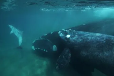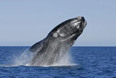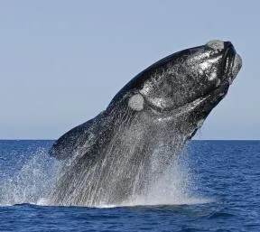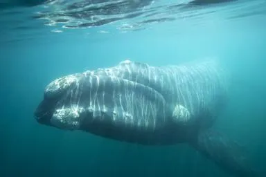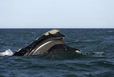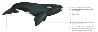 Cette baleine franche (grasse) présente un corps trapu de couleurs noire avec des callosités blanches sur la tête. Faisant partie des baleines à fanons, elle s'alimente en avançant bouche ouverte à travers du plancton. Coté comportement, elle impressionne les observateurs pas ses sauts hors de l'eau en retombant sur le dos.