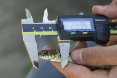 Mesure de la tête d'une couleuvre à collier dans une étude de la Réserve naturelle régionale du bocage des Antonins en 2021 (Philippe Massit, OFB)