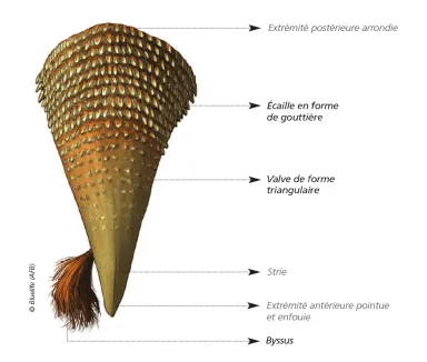 - forme triangulaire avec 2 valves (extrémités antérieure pointue et enfouie, postérieure arrondie) ;