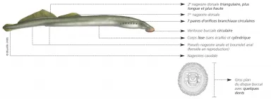 Schéma explicatif de la morphologie de la Lamproie fluviatile (Bluelife/OFB)