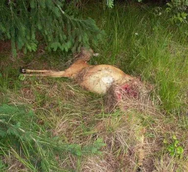 Chevreuil tué par un lynx, la partie consommée (gigot) est recouverte d’herbes sèches (réseau Loup-lynx)