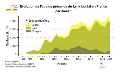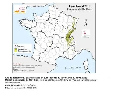 L’aire de présence régulière nationale est en augmentation depuis le retour du Lynx sur le territoire. Elle est actuellement estimée à 8 800 km2 concentrés sur les 3 massifs de l’est de la France : les Vosges, le Jura et les Alpes (cf. carte de présence 2018).