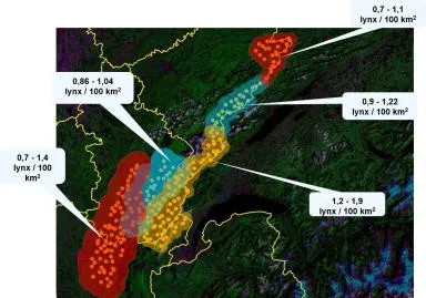 De ce suivi intensif réalisé dans le Jura français entre 2011 et 2014, ressort une densité moyenne d’environ 1 lynx pour 100 km², avec néanmoins d’importantes variations locales de densité.