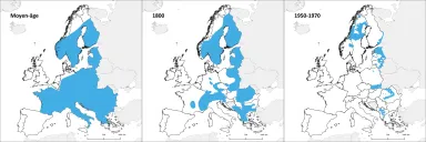 Évolution historique de répartition de la population de lynx en Europe (OFB d’après Kratochvil, 1968 et Chapron et al., 2014)