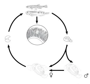 Les « poissons-hôtes » sont des moyens de transport. Les larves se fixent aux branchies à l’aide de deux crochets et s’enkystent plusieurs jours. La durée varie en fonction des espèces de poisson et des conditions du milieu. Cette étape est primordiale pour la survie des larves et la dispersion de l’espèce. Elles profitent de la mobilité des poissons pour se disperser et remonter le courant de la rivière, impossible par leurs propres moyens.