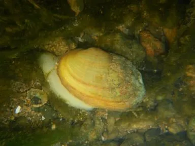 Mulette épaisse sortie du substrat laissant apparaître son pied servant au déplacement (Florent Lamand, OFB)
