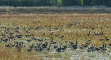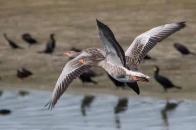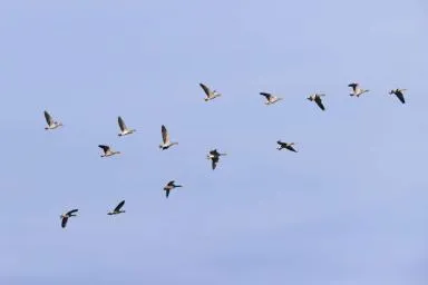Oies cendrées en vol dans la réserve du Marquenterre en baie de Somme (Jean-Bernard Puchala, OFB)